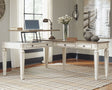 Elevating the art of traditional cottage styling, this L-shaped desk is your heavenly home office realized. Two-tone finish combines chipped white with distressed wood tone tops for added charm. Framed drawer fronts, decorative corbels and elegantly turned and tapered legs add refinement, while dark bronze-tone knobs lend a classic touch. Spring lift top raises the surface to a comfortable standing position, for a healthy alternative. Built for looks and productivity, the built-in power supply and dual USB ports keep your devices close at hand and ready to go.