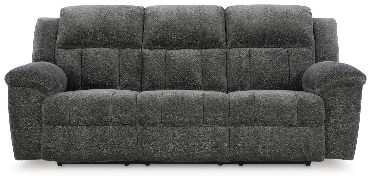 Large scale, value added motion sofa with a plush, ultra soft textured polyester fabric. Plush pillow top arms, pad over chaise, comfort channels in the lumber and chaise. Features storage console loveseat.