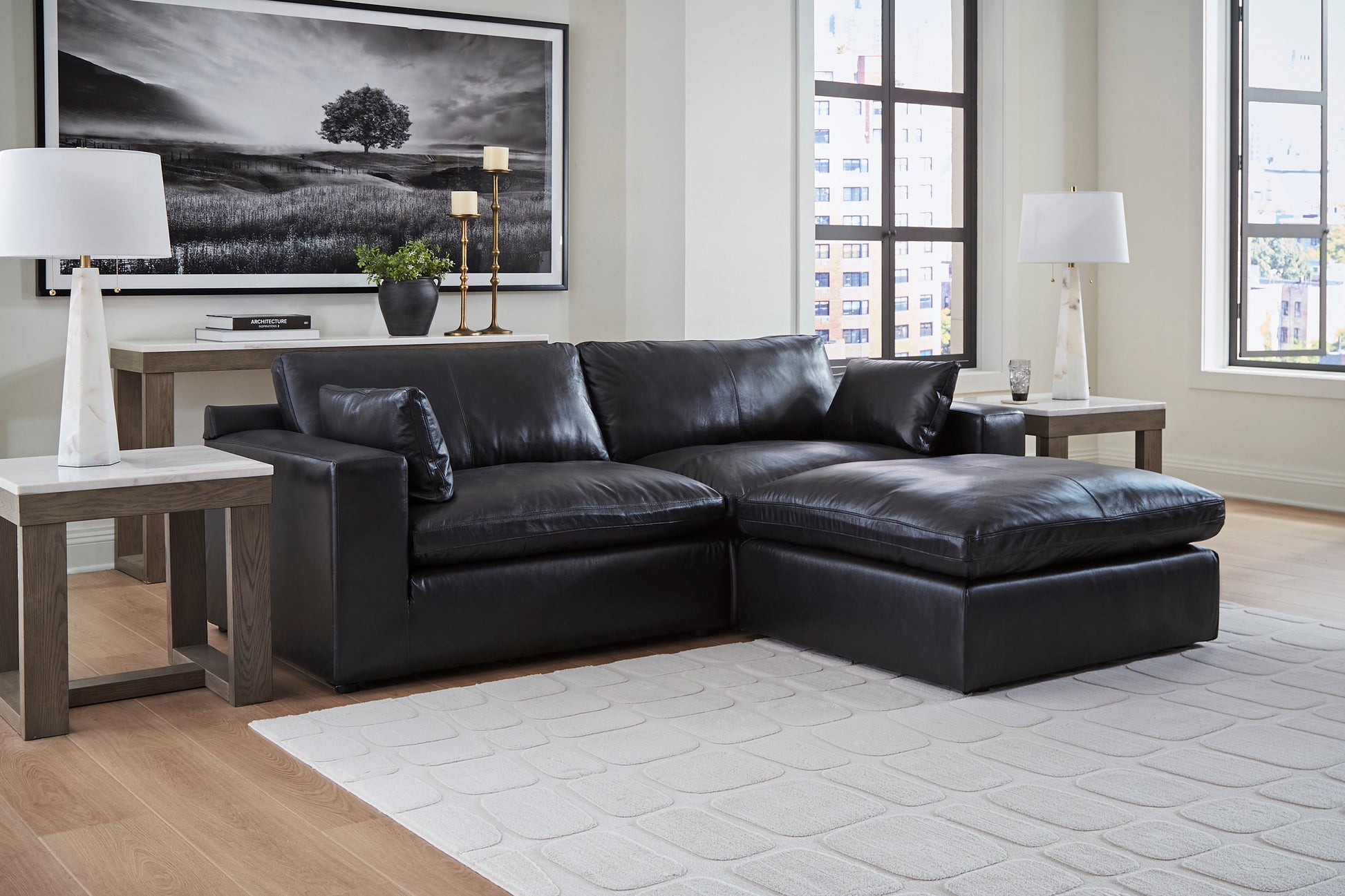 Catering to your contemporary lifestyle, this sectional loveseat is a handsome marriage of masculine and feminine sensibilities. Feather-fiber cushions and bolster pillows soften the look of its chunky, linear silhouette. A warmly hued combination of leather and faux leather upholstery levels up the affordable luxury. And you'll never run out of ways to stage this seating arrangement—each piece is fully finished on all sides and capable of standing solo. Urban sophistication has never been more versatile.